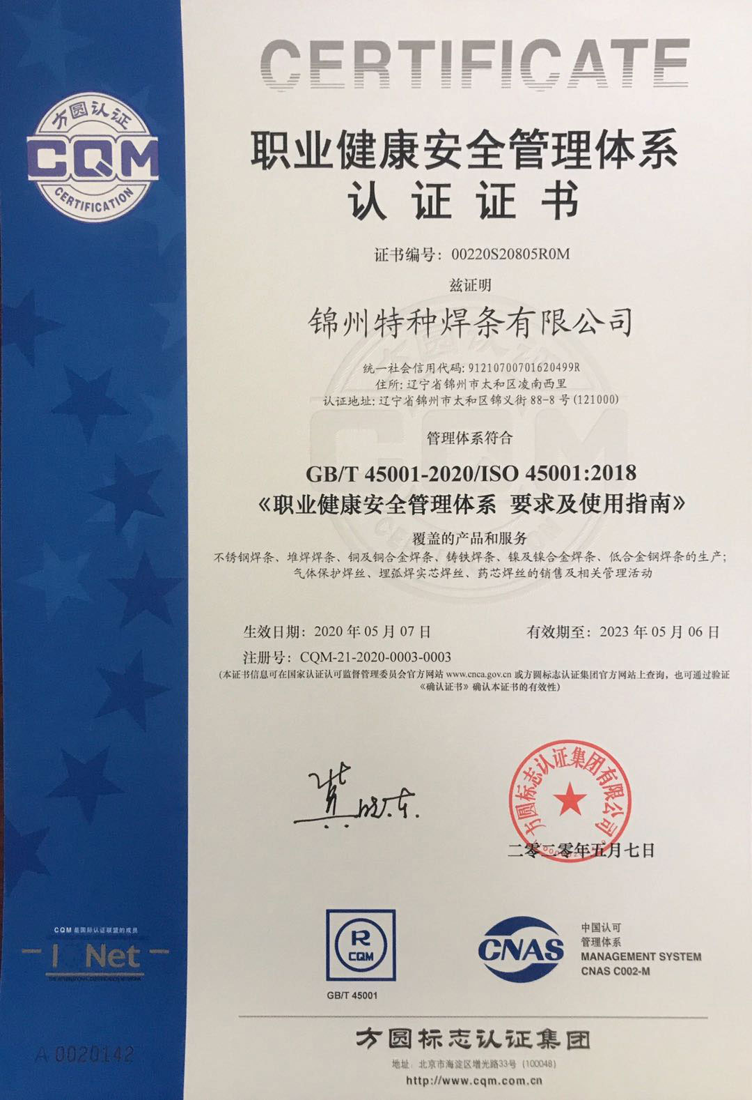Certification Category:GB/T 45001-2020/ISO 45001:2018 Occupational health and safety management systems -- Requirements with guidance for use